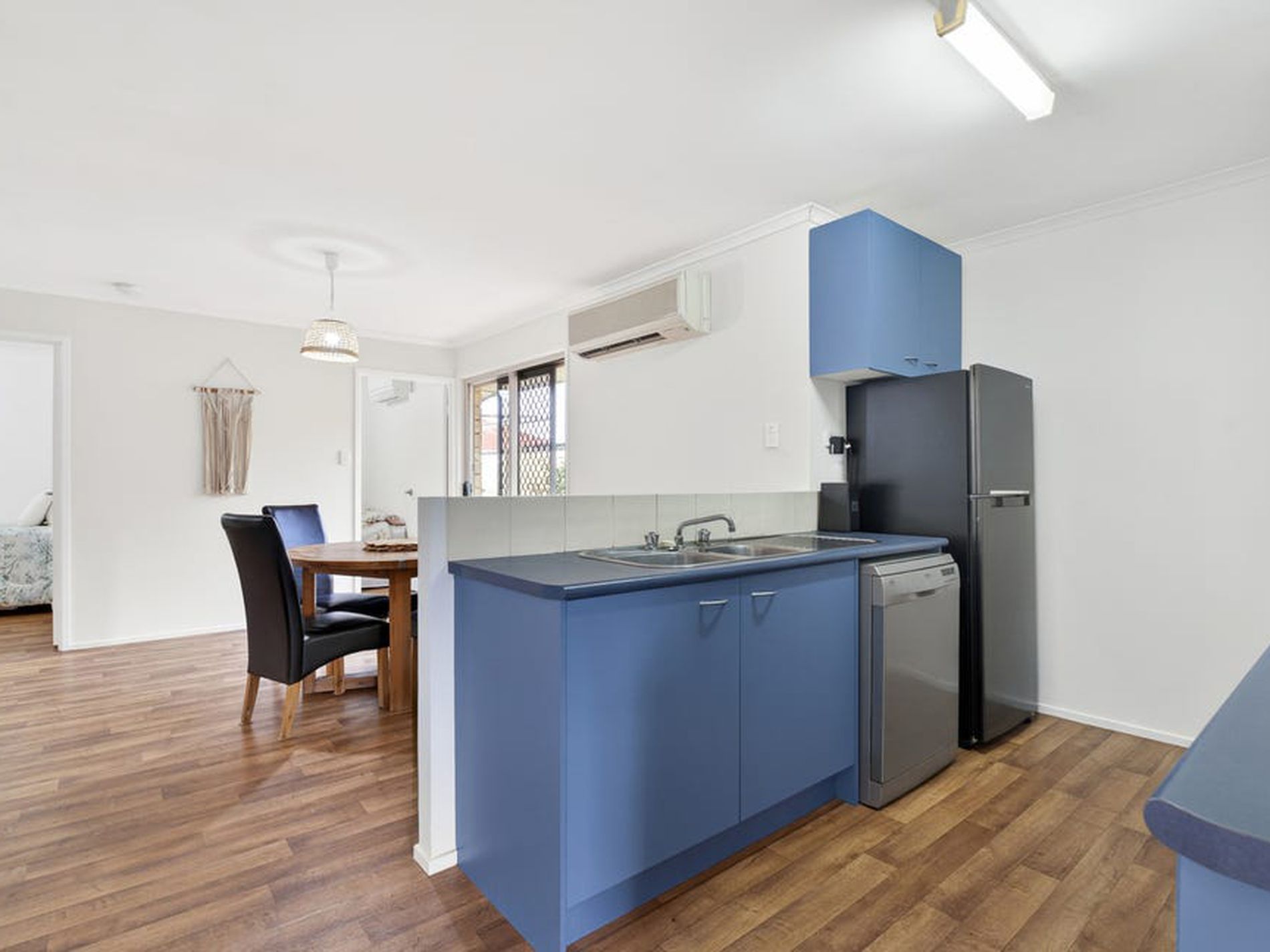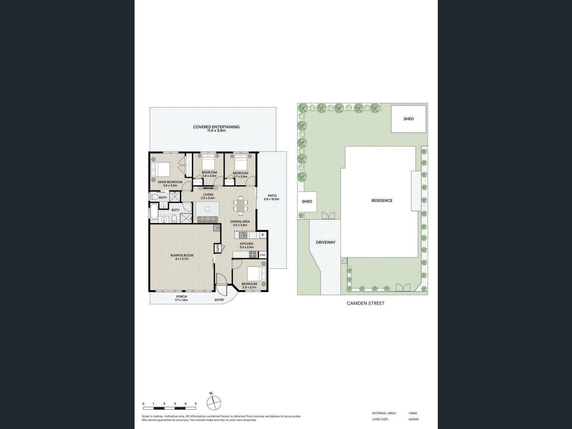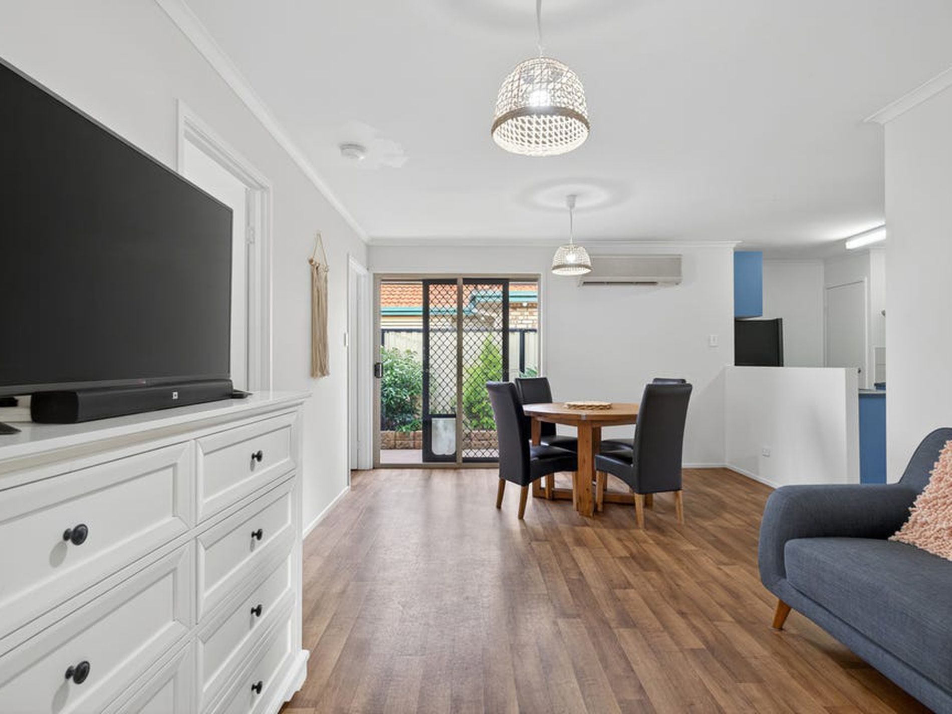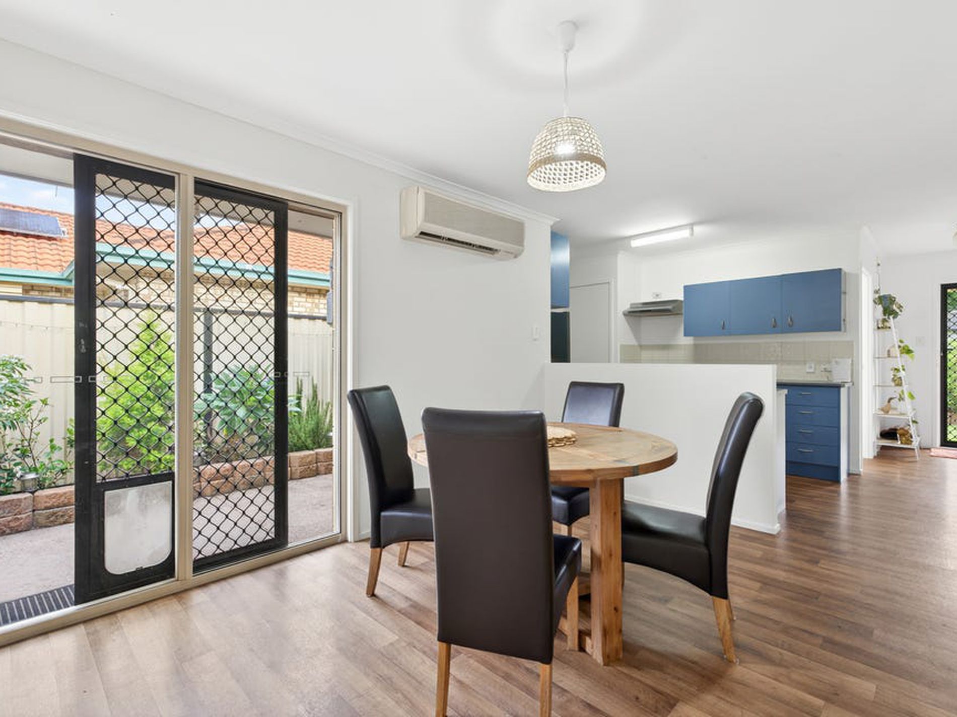 - Covered tiled outdoor entertaining area with pull-down blinds